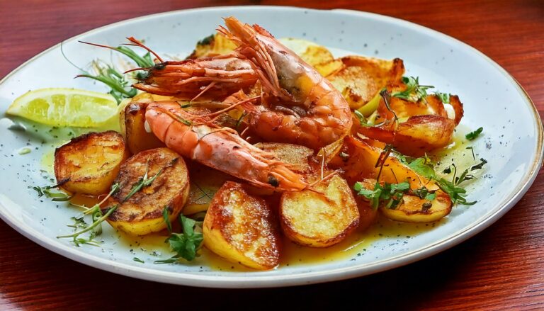 Potato Royale: Grillkartoffelsalat mit Fenchel und Schmand, Riesengarnele in Ahornsirup und Tabasco