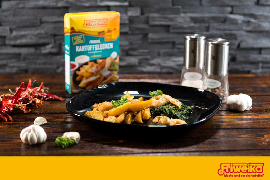 Knusprige Kartoffelecken, leckerer Spinat und als Krönung Garnelen. Jetzt noch Kerzen auf den Tisch und schon fühlt es sich an wie im Restaurant. Genießt die Zeit und bleibt gesund!