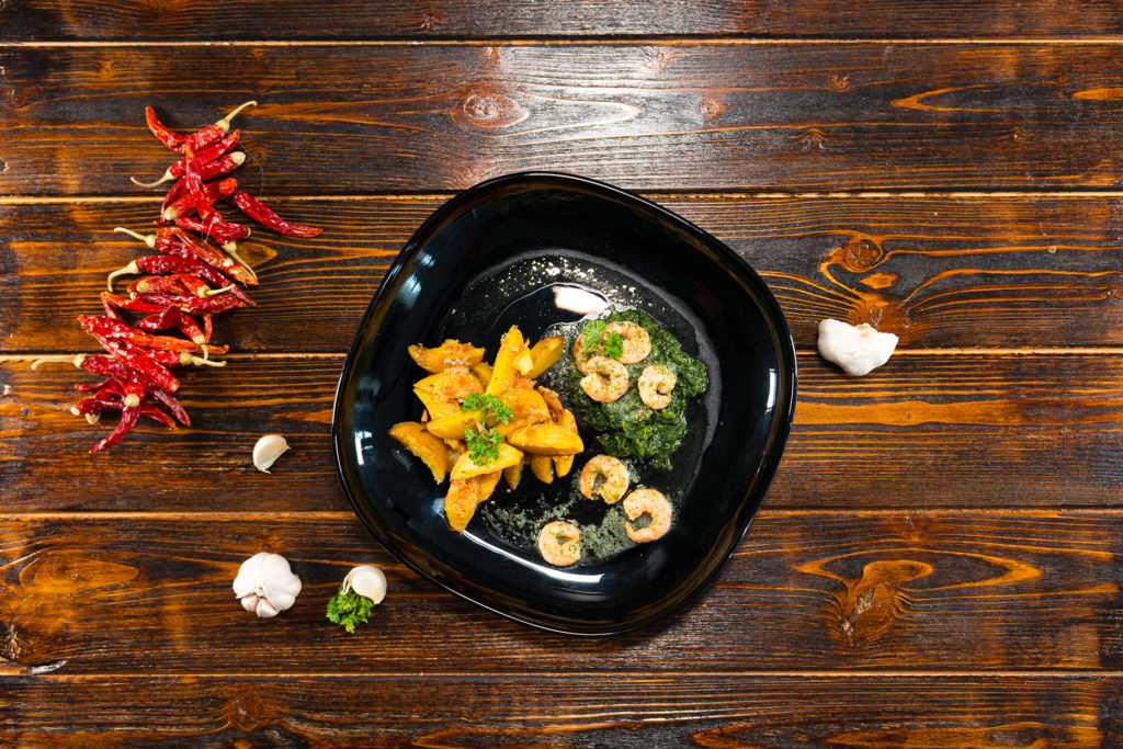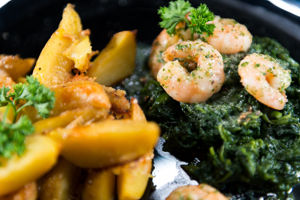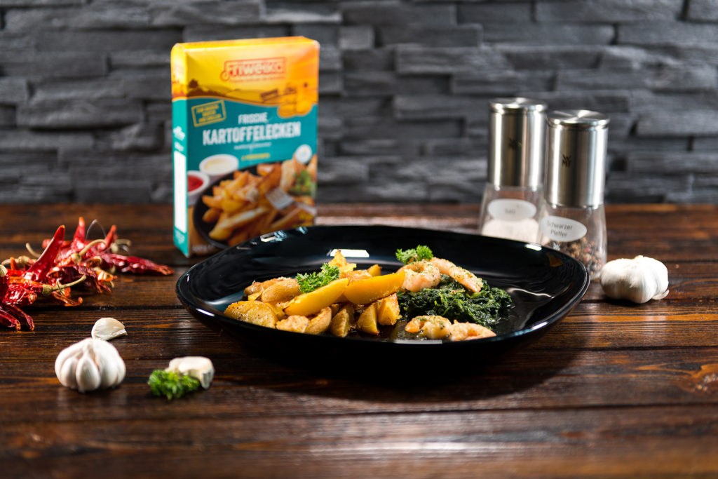 Abschließend die Garnelen auf einem Spinatbett anrichten und mit den Kartoffelecken servieren.