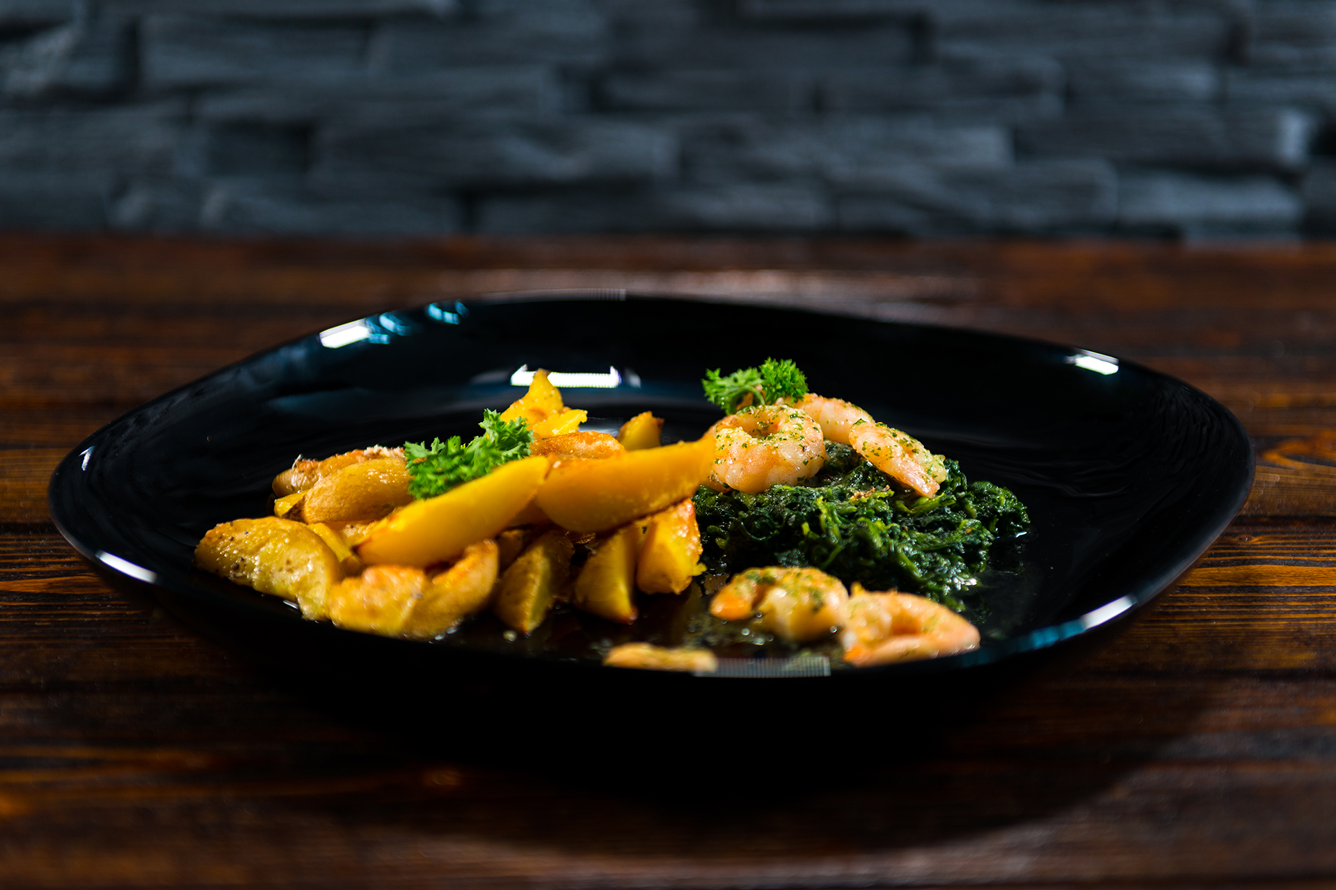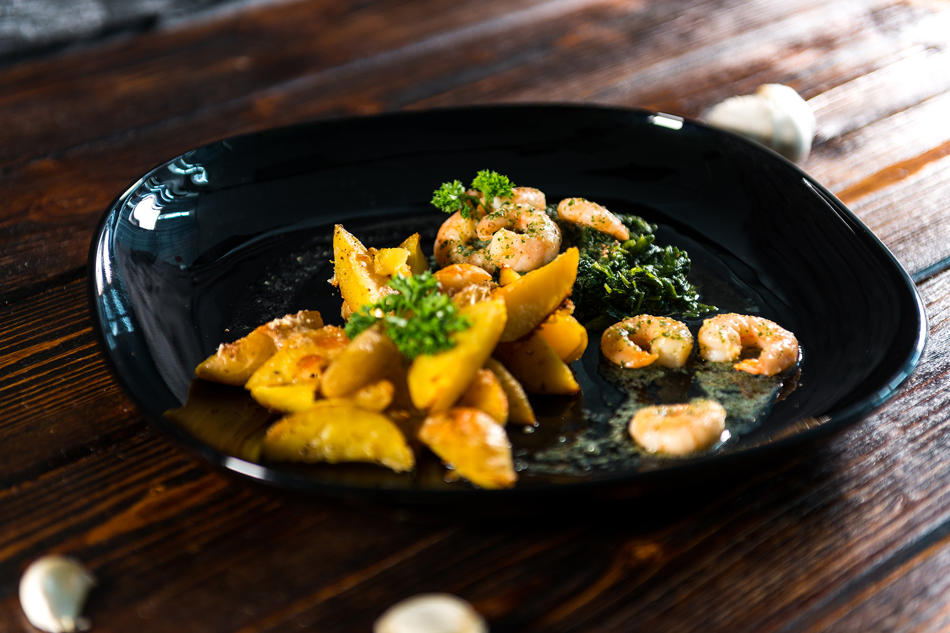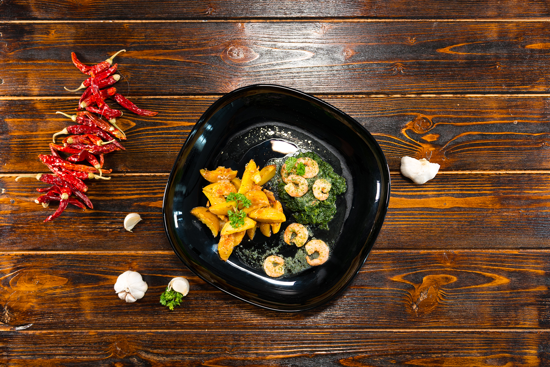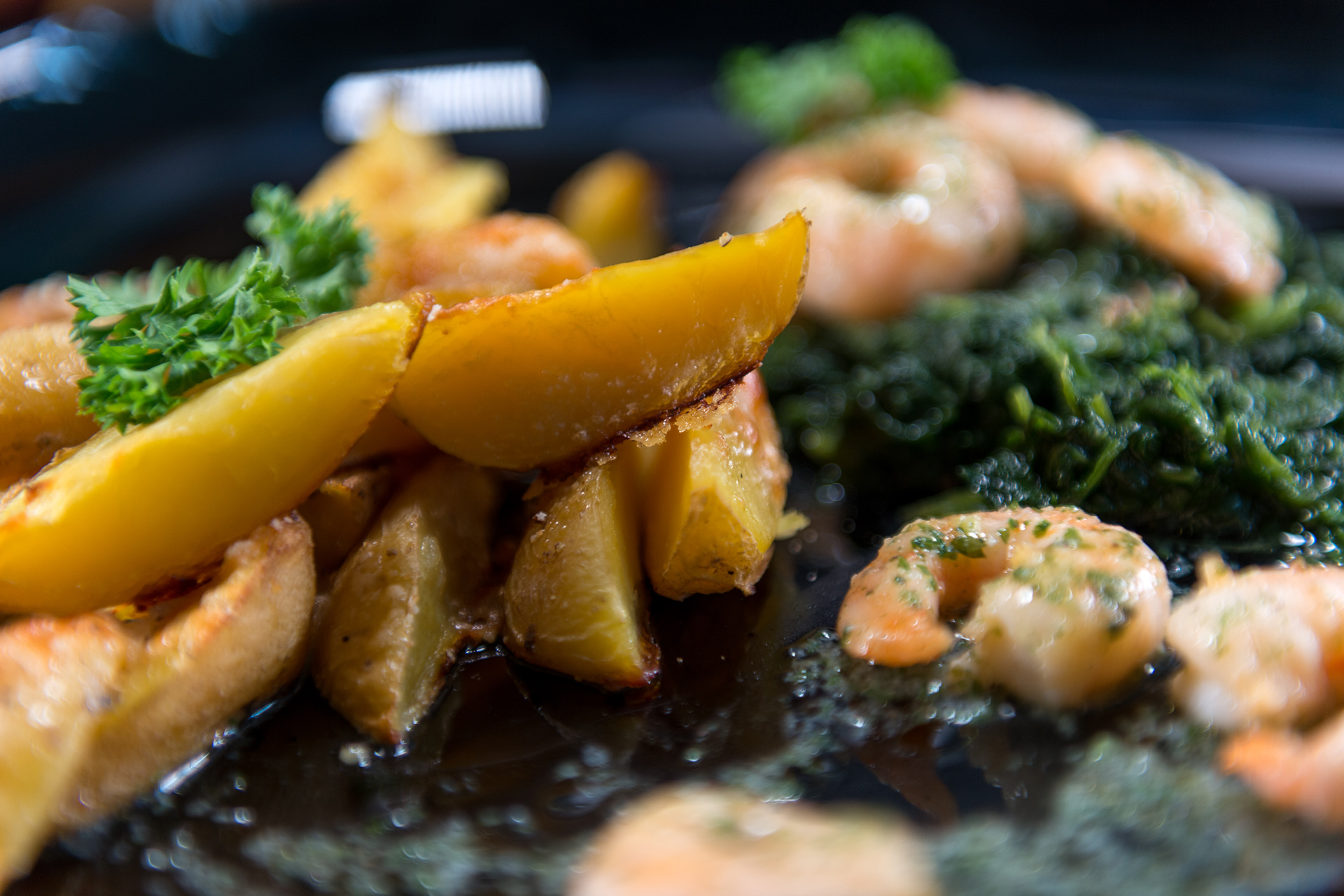 Abschließend die Garnelen auf einem Spinatbett anrichten und mit den Kartoffelecken servieren.
