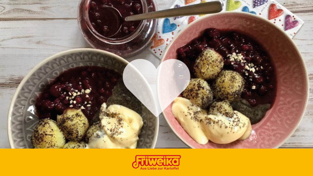 Diesmal gab es süße Friweika Klöße mit Mohn-Soße, dazu Vanille-Skyr und Rote Kirsch-Heidelbeer-Grütze. Wer kann da schon Nein sagen?