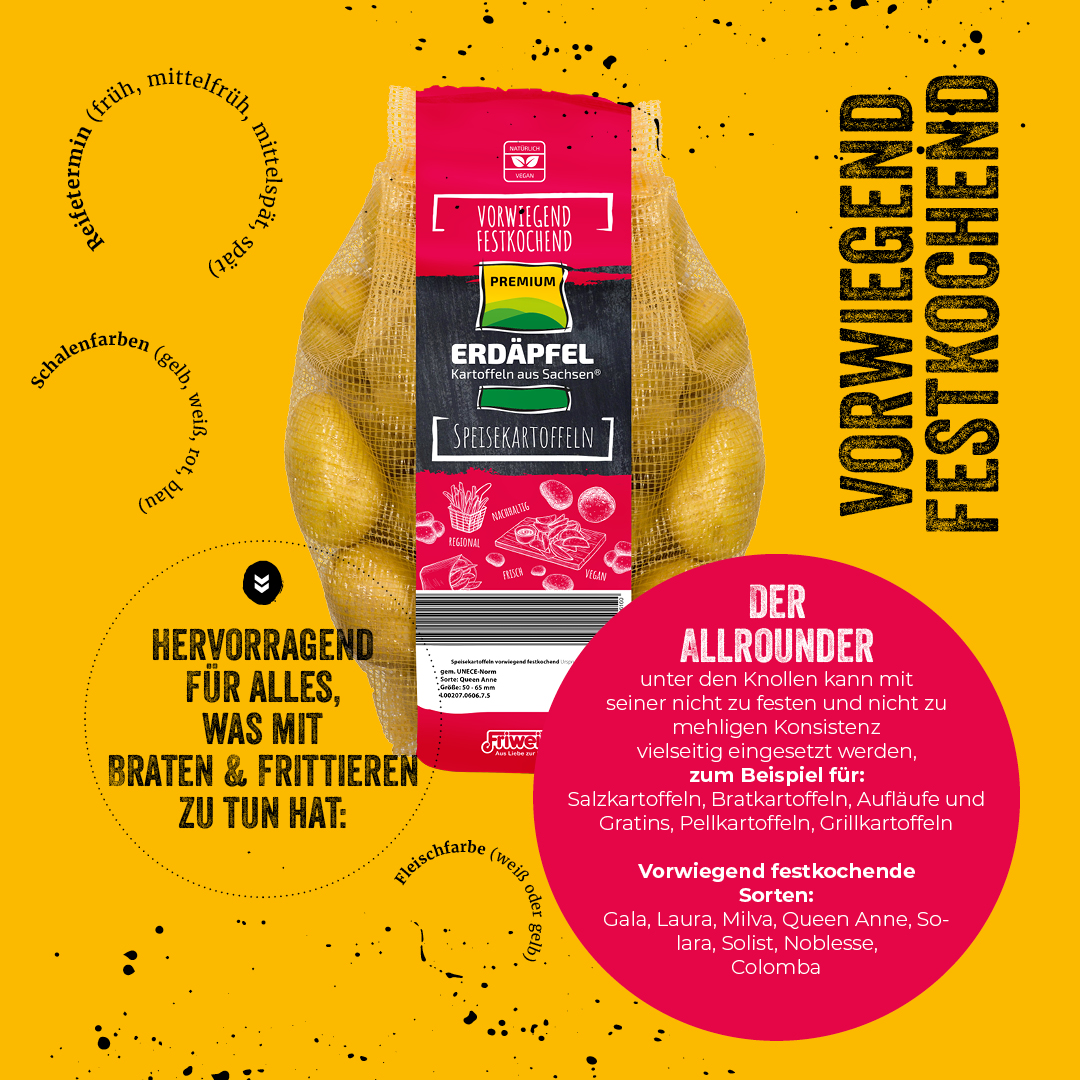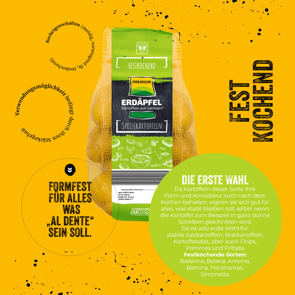 Festkochende Kartoffeln werden am häufigsten genutzt. Diese behalten nach dem Kochen ihre Form und eignen sich deshalb hervorragend für Salzkartoffeln, Bratkartoffeln, Kartoffelsalat und natürlich Pommes. Zu den bekanntesten Sorten gehören Ballerina, Belana, Antonia und Bernina.