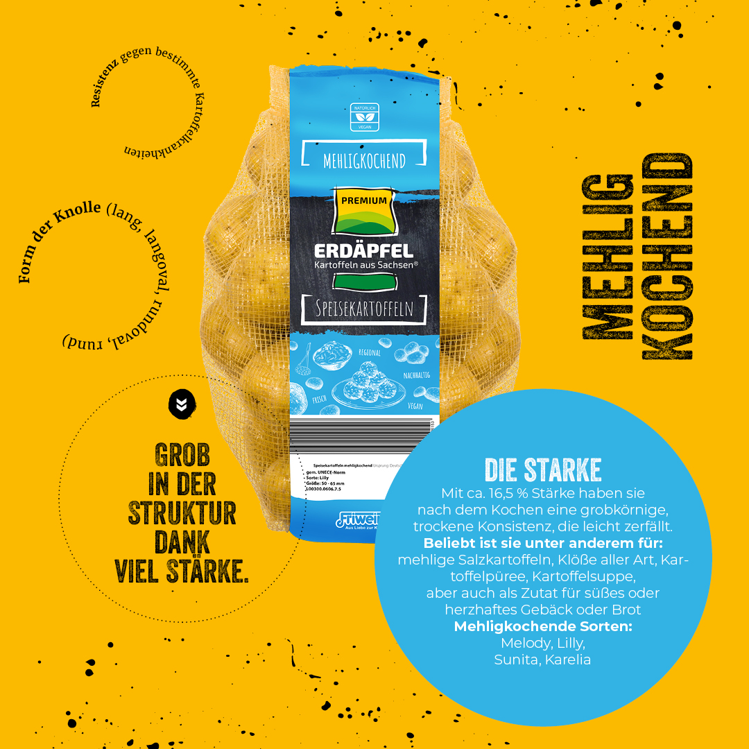 Dagegen haben die mehligkochenden Kartoffeln mit einer Stärke von 16,5% nach dem Kochen eine trockene und grobkörnige Konsistenz, die leicht zerfällt. Daraus können Klöße geformt oder Kartoffelpürree gedrückt werden. Außerdem können sie auch als Zutat fürs Brot backen dienen. Melody, Lilly, Sunita und Karelia sind hierfür die Sorten.