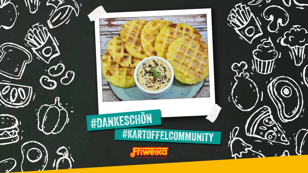 Die Kloßteigmasse zu kleinen Kugeln formen, platt drücken und mit etwas Käse und Kochschinken befüllen. Noch etwas Kloßteig obendrauf geben und in einem kleinen Waffeleisen ausbacken. Dazu passt ein Dip nach Wahl.