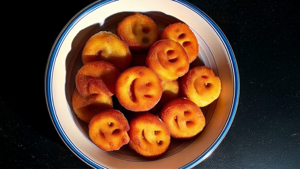 | 𝗗𝘂 𝗯𝗿𝗮𝘂𝗰𝗵𝘀𝘁 • 400 g Kartoffeln • 30 g Speisestärke • 30 g Mehl • 30 g Semmelbrösel • 2 TL Salz • ½ TL Pfeffer • optional weitere Gewürze, z. B. Rosmarin / Muskatnuss • 1 Ei • Frittierfett | 𝗭𝘂𝗯𝗲𝗿𝗲𝗶𝘁𝘂𝗻𝗴 1. Kartoffeln schälen, würfeln und anschließend ca. 15 – 20 Minuten kochen, dann abgießen. 2. Kartoffelstücke in eine Schüssel geben. Speisestärke, Mehl und Semmelbrösel hinzufügen. 2 TL Salz, reichlich Pfeffer und optional weitere Gewürze ergänzen. Nun alles zerdrücken und mit einer Gabel oder einem Kartoffelstampfer vermengen. Dann das Ei dazugeben und auch dieses einarbeiten, so dass eine Art fester Kartoffelbrei entsteht. 3. Eine Arbeitsfläche mit Backpapier auslegen und mit reichlich Mehl bestreuen. Den Kartoffelbrei darauf geben und breit streichen. Die Oberseite wieder großzügig mit Mehl bestreuen und einen zweiten Bogen Backpapier auflegen. Die Masse nun mit einer Teigrolle ca. einen halben Zentimeter dick ausrollen. 4. Die obere Lage Backpapier abziehen und mit einem Keksausstecher oder Glas Kreise mit einem Durchmesser von 4 bis 5 Zentimetern ausstechen. Teigreste können neu ausgerollt und ebenso verarbeitet werden. Mit einem Trinkhalm werden die Augen der Smileys ausgestochen. Anschließend mit einem Teelöffel den lachenden Mund formen. 5. Öl – ca. 4 bis 5 Zentimeter hoch – in einen Topf oder eine tiefe Pfanne gießen und erhitzen. Die Smileys in das heiße Öl geben und 4 bis 5 Minuten frittieren. Dabei einmal wenden und – wenn sie goldgelb oder hellbraun gefärbt sind – herausnehmen und auf Küchenpapier kurz abtropfen lassen. |