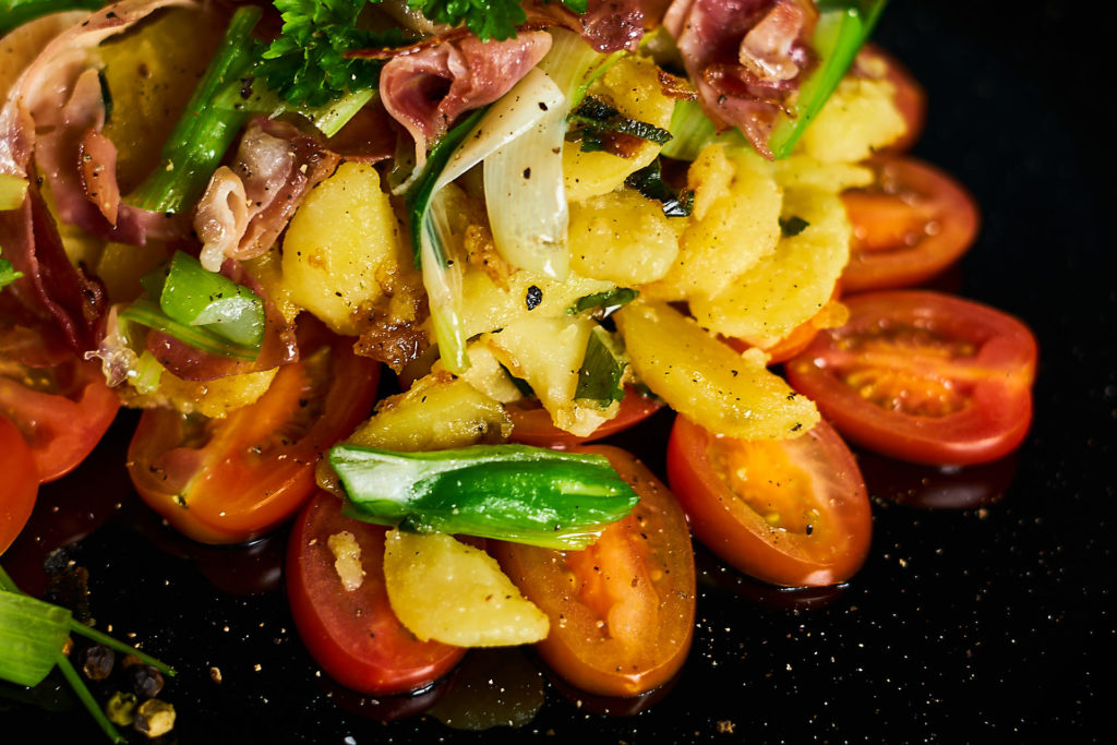 - In einer zweiten Pfanne 1 El Öl erhitzen, die langen Frühlingszwiebelstücke darin kurz anbraten, Speck zugeben und knusprig ausbraten. Kartoffelmischung in einem Sieb abtropfen lassen. Auf den Tomatenscheiben anrichten. Speckmischung darauf verteilen. Mit restlichem Olivenöl beträufelt servieren.