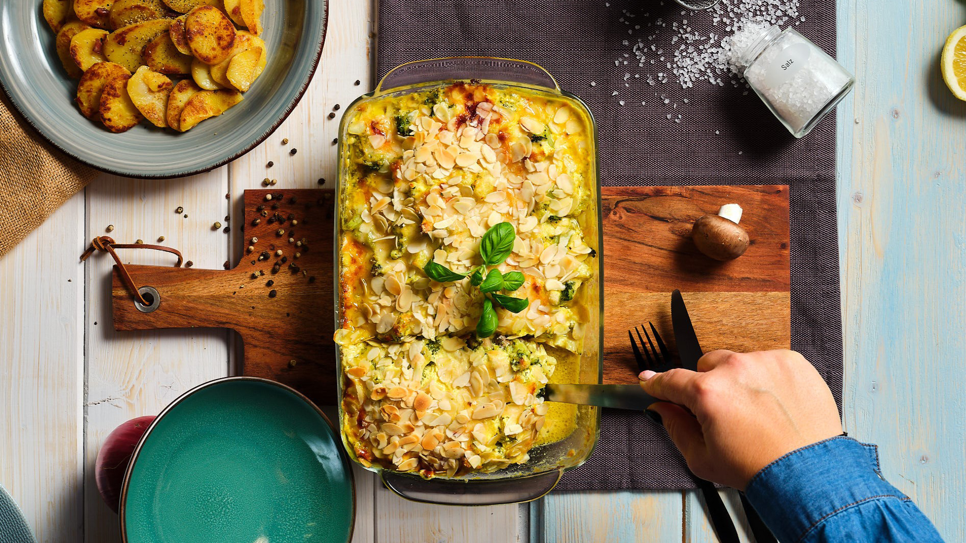 Die Sauce gleichmäßig über die Filets und das Gemüse gießen. Mit gehobeltem Parmesan bestreuen und für 18-20 Minuten auf mittlerer Schiene im Ofen backen. Nach 15 Minuten die Mandelblättchen über den Auflauf streuen.