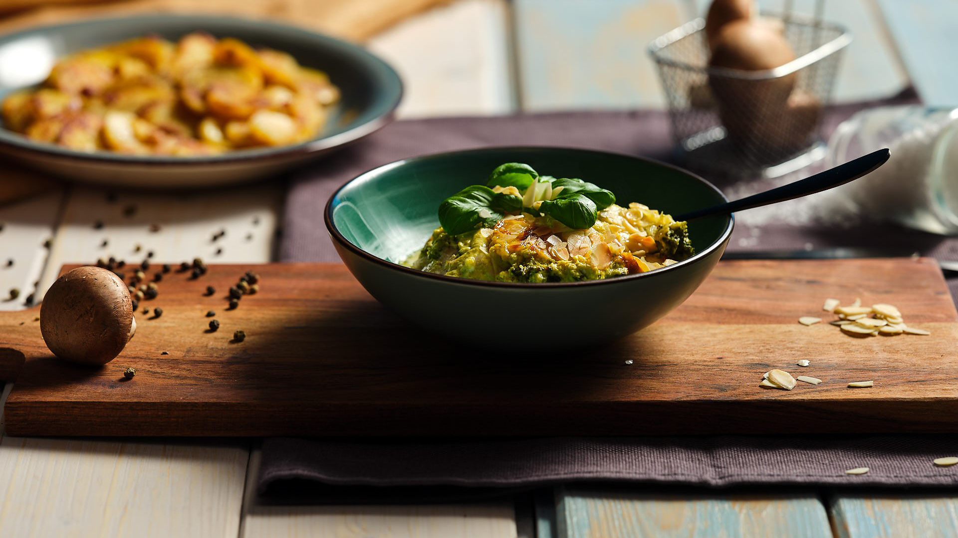 In der Zwischenzeit Olivenöl in einer beschichteten Pfanne erhitzen, die Hähnchenbrustfilets von beiden Seiten für 3 Minuten anbraten. Zwiebel und Champignons dazu geben und kurz mitbraten. Hähnchenbrustfilets, Champignons und Zwiebeln gleichmäßig in einer Auflaufform verteilen.