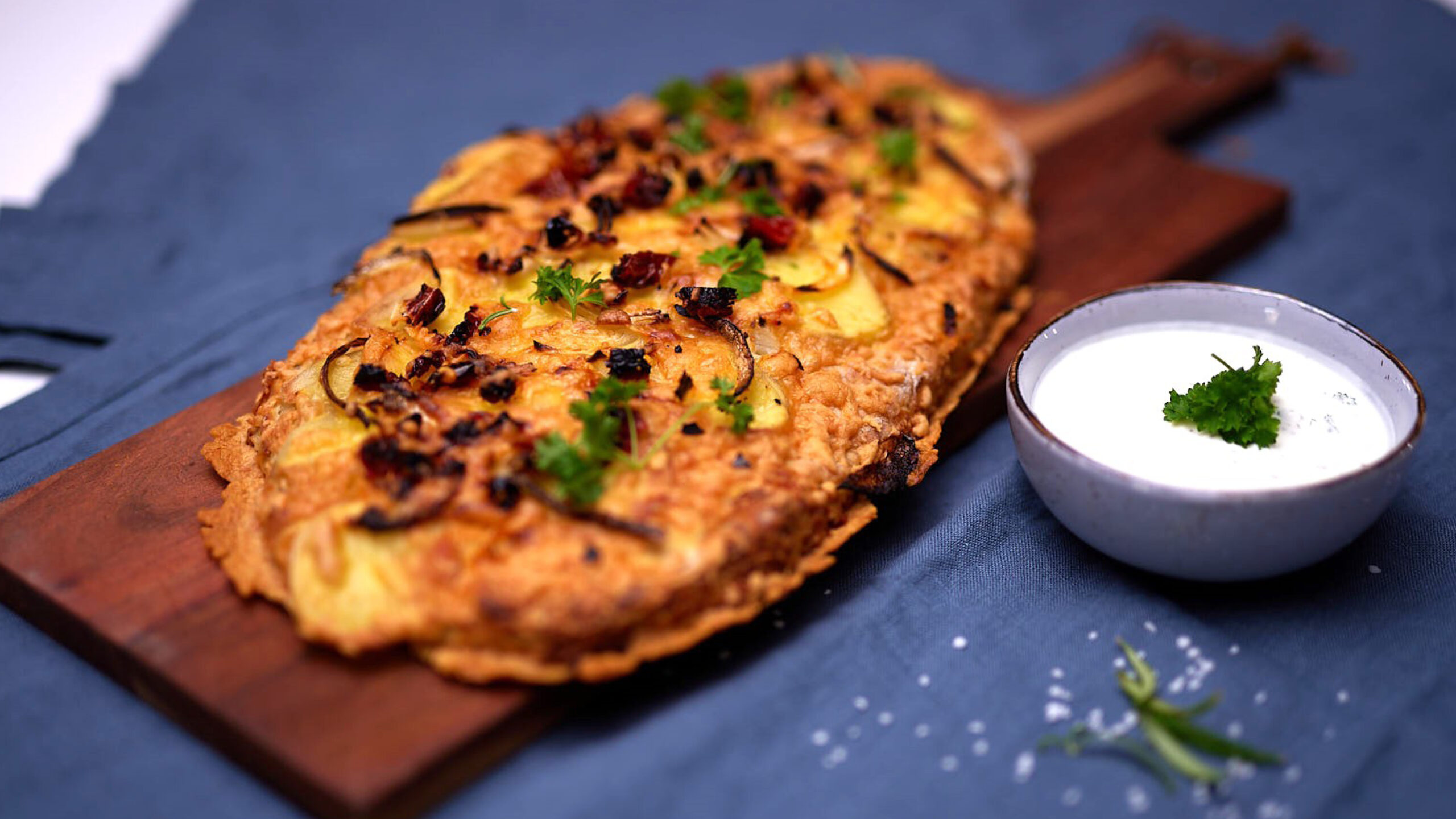 Auf einer mit Mehl bestreuten Arbeitsfläche den Teig nochmal kneten, auf ein mit Backpapier ausgelegtes Backblech platzieren und formen. Streukäse, Kartoffelscheiben, Zwiebeln, Tomaten darauf verteilen und für 40–45 Minuten im heißen Ofen backen. Im Anschluss mit Petersilie bestreuen und mit einem Dip eurer Wahl servieren.