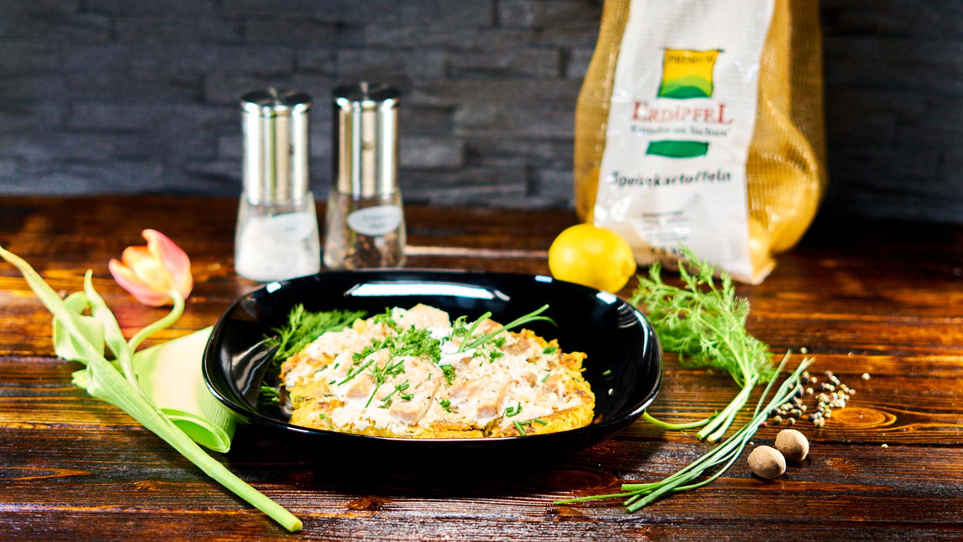 - Lauch putzen und waschen, der Länge nach halbieren und in feine Ringe schneiden. Die Freiweika-Kartoffeln schälen und grob raspeln. Den Lauch in 2 EL heißem Olivenöl ca. 4 Minuten anbraten. Kartoffelraspel gut ausdrücken, in eine Schüssel geben, Lauch und Eigelb untermischen, mit Salz und Muskat würzen.