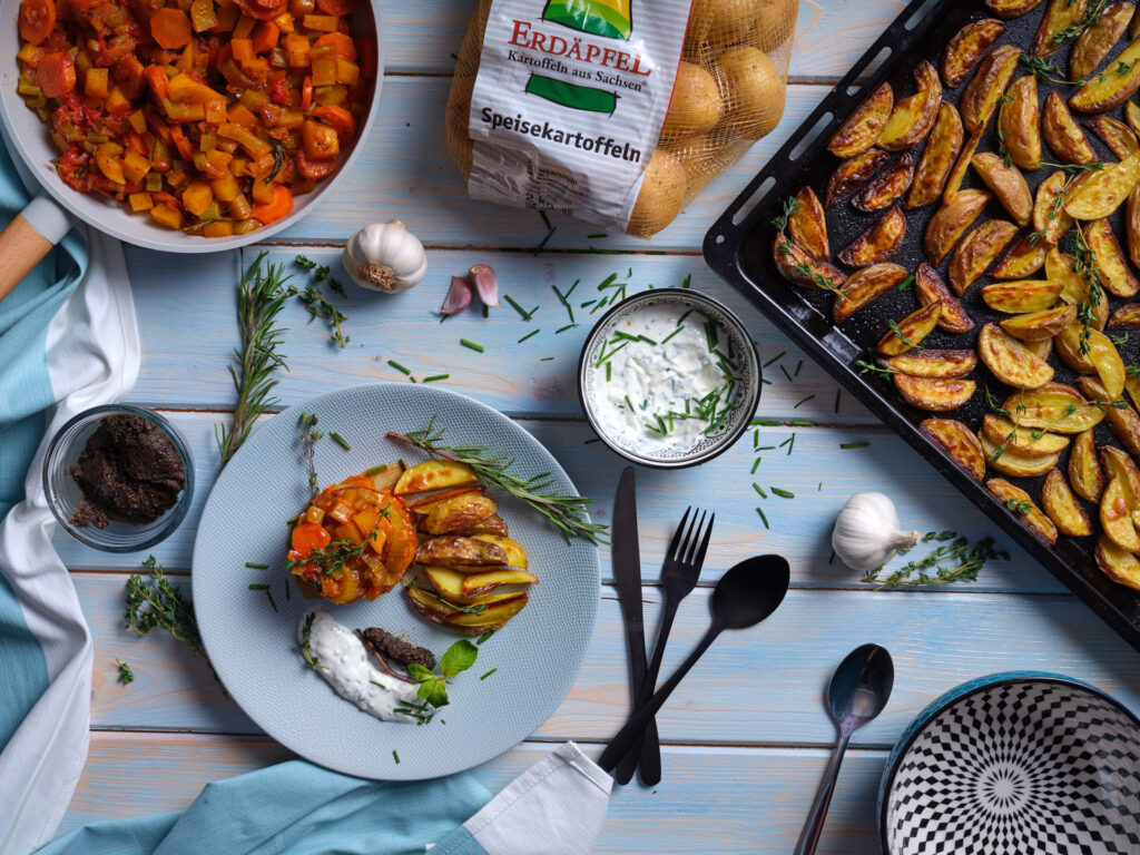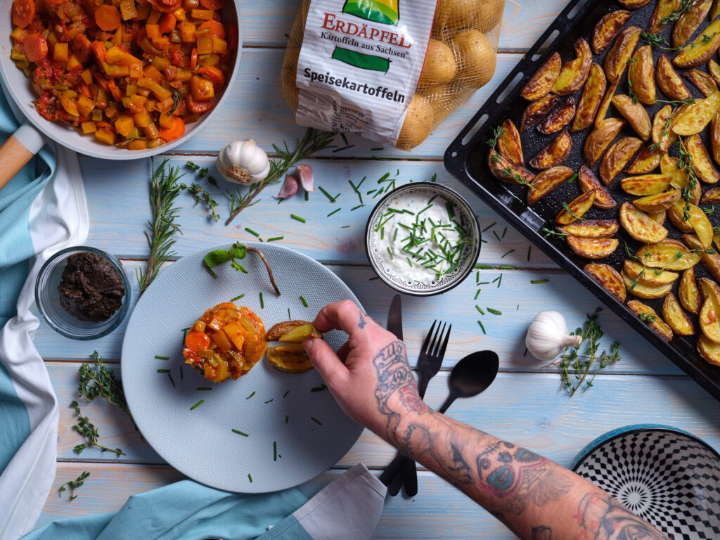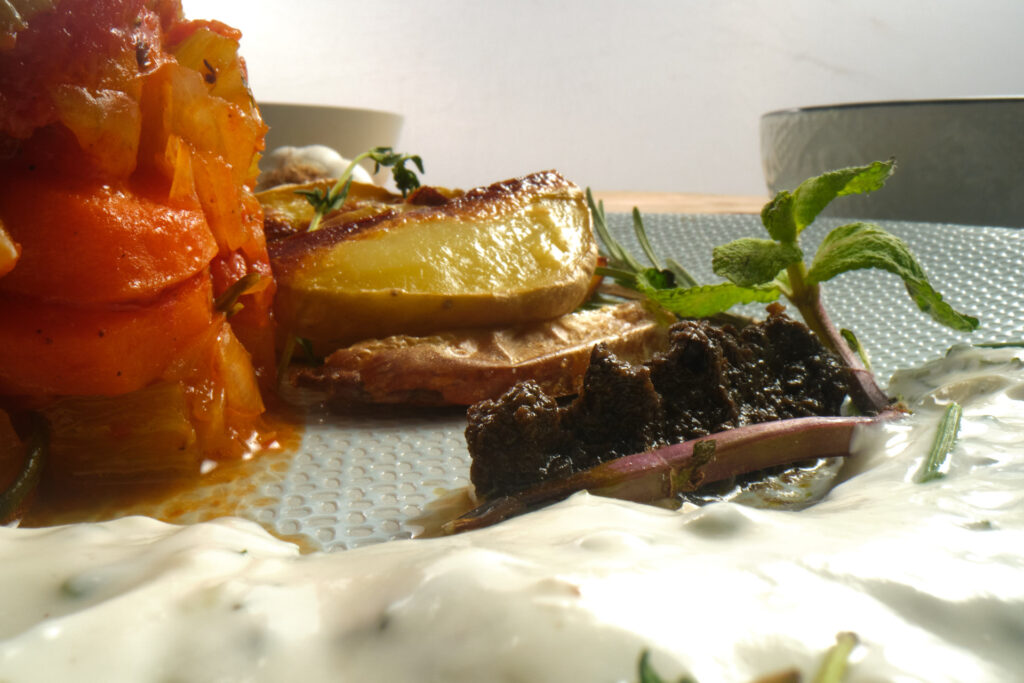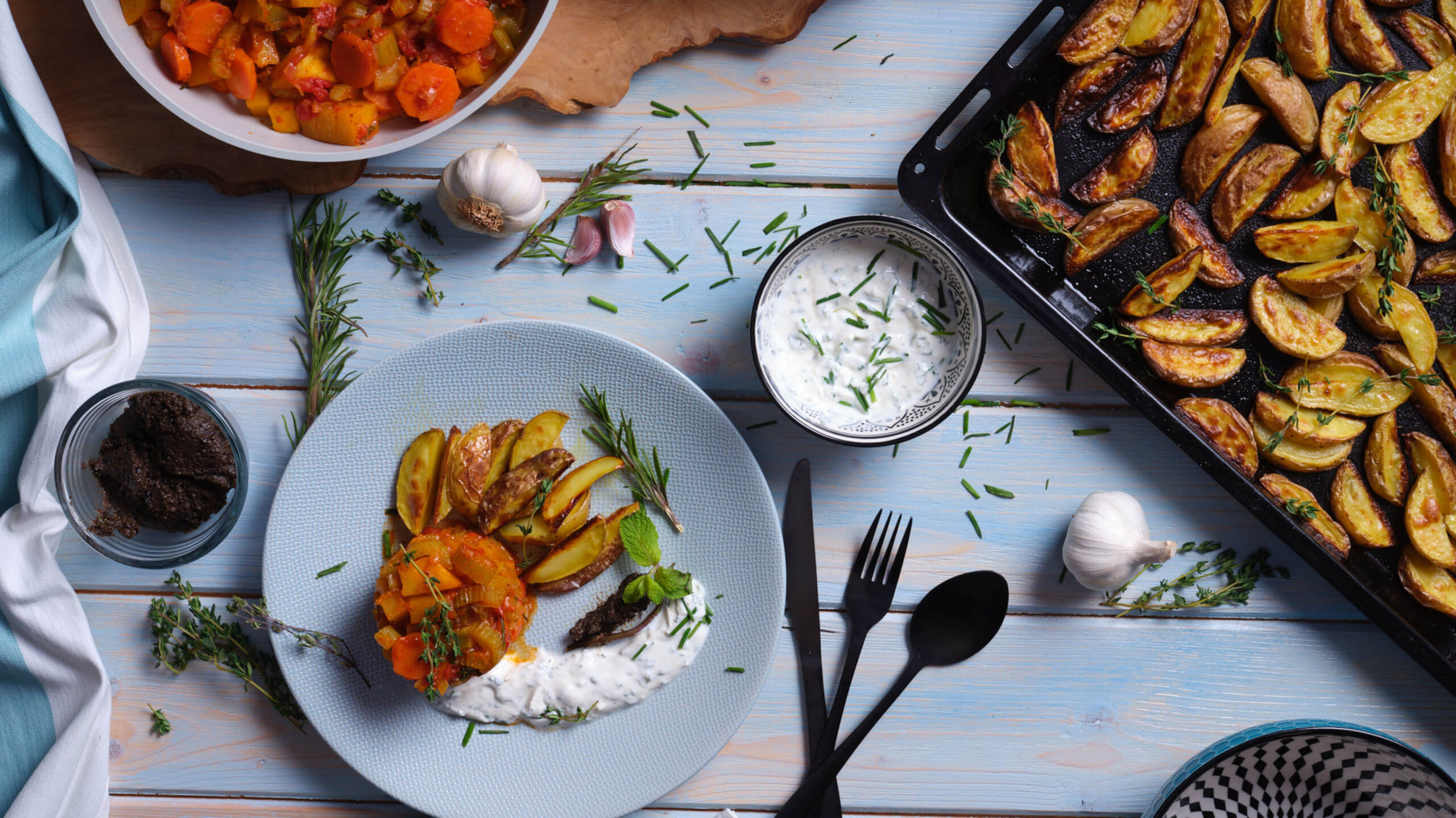 Für die Tapenade Knoblauch schälen. Oliven und Knoblauch mit dem Pürierstab fein zerkleinern. Mit Pfeffer würzen. Ratatouille, Kartoffeln und Dips anrichten.