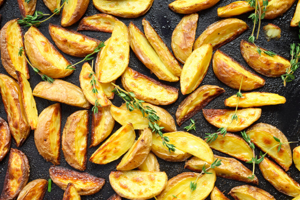 Kartoffeln gründlich waschen, in Spalten schneiden, mit Salz würzen. Auf einem eingeölten Backblech verteilen und mit 2 EL Öl beträufeln. Im vorgeheizten Backofen (E-Herd: 200 °C/ Umluft: 175 °C/ Gas: Stufe 3) ca. 40 Minuten garen.
