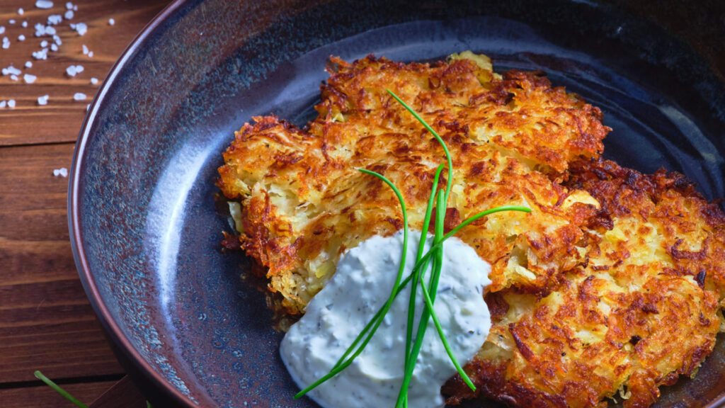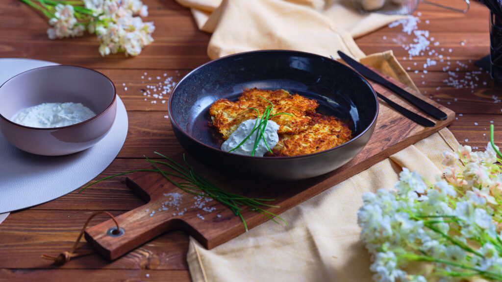 Die Kartoffeln reiben. Alle Zutaten (außer dem Öl) mischen, abschmecken und in heißem Öl ausbacken, bis die Puffer schön braun und knusprig sind. Das Ganze kann man auch mit der gleichen Menge Zucchini oder Kürbis machen. Dann aber mit Rosmarin und Thymian würzen.